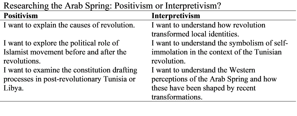 You need to establish where the project lies in relation to the two epistemological perspectives. In order to decide, you should ask yourself, what your interest in a given topic is; what you want to know about it; and what kind of knowledge you want to create. Your answers will guide you in making coherent choices in relation to research design and research method. See below the example of a student interested in researching the Arab Spring: