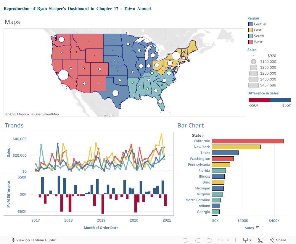 Nevertheless, Part I covers the key concepts that every Tableau user should know. With the chapters in that section make, a brand-new Tableau user can learn how to use Tableau with only this book. I skimmed through the introductory sections of Part I because they comprise things I already learnt in Alexander’s book. But they offered me the opportunity to review basic concepts and ensure that I have the prerequisites required for subsequent chapters. By the end of Part I, I had the prerequisites to apply the “201-level” material. At this point, I was able to reproduce the interactive dashboard below.