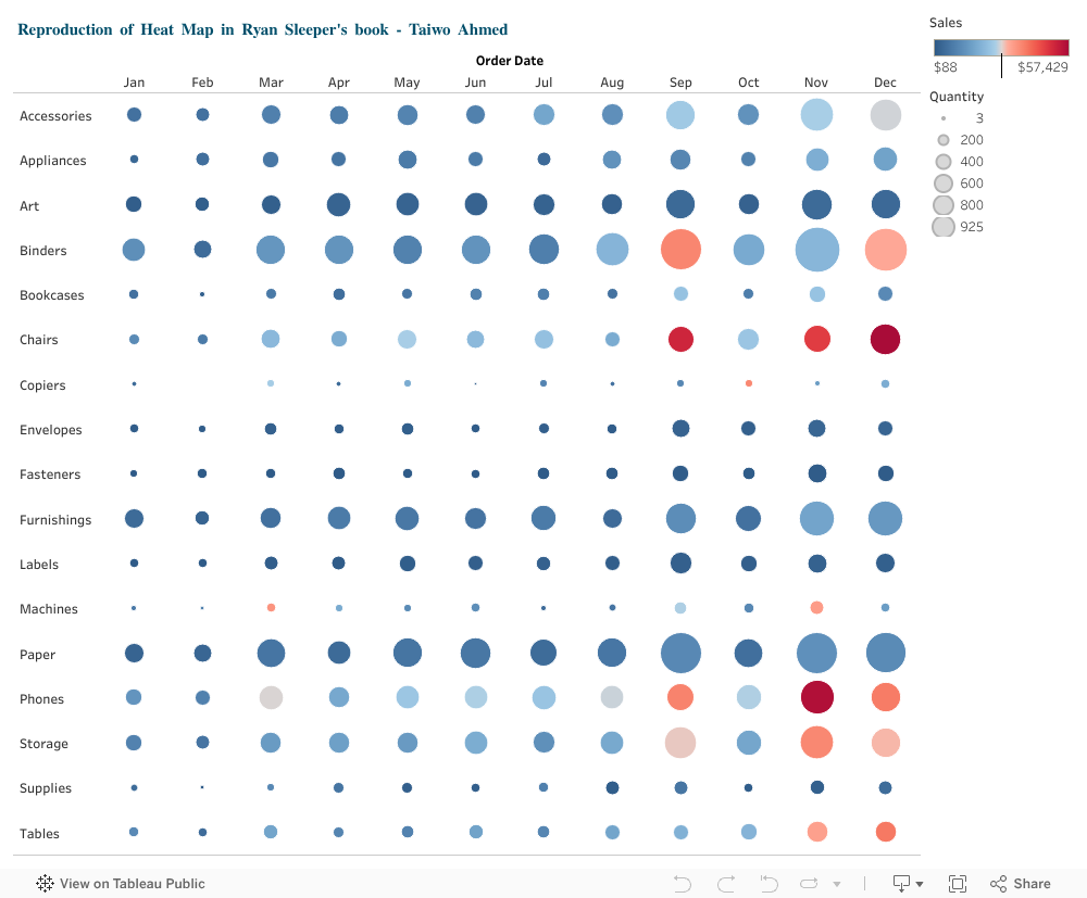 In a heatmap, the values of an indicator are described in circles with different sizes. Higher values have bigger circles with intense colors. That’s why they are called heatmap. In the visualisation above, large blue circles mean that although a sub-category sold a relatively large quantity, it relatively brought in low revenue. But small red circles means the quantity sold in the sub-category is relatively small; yet a relatively high revenue is generated.