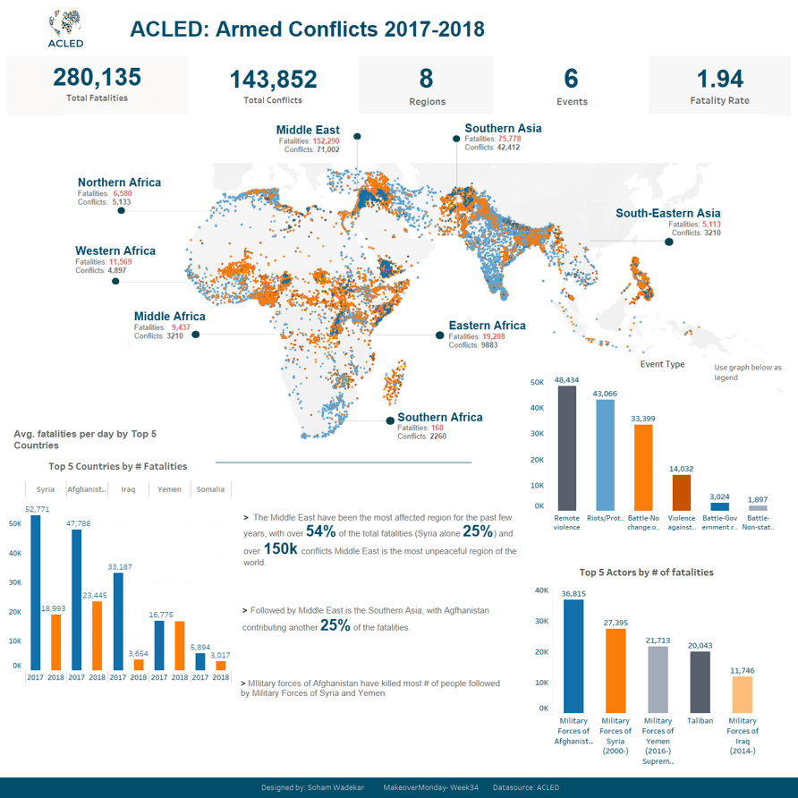 Although Ryan demonstrates the usefulness of Tableau with business-oriented examples, Tableau can be useful in visualizing phenomenon in other areas of social science. For example, I came across an impressive visualization on conflicts by Soham Wadekar (see image below). I aspire to being able to create this kind of visualisation.