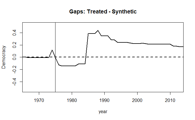 The second table ($tab.v) shows the weights of the chosen predictors. That is, how good is each variable in predicting pre-treatment values of democracy? A variable with a small weight is not a good predictor of democracy. In our case, the average level of democracy in 1970, which captures the quality of pre-existing institutions in that year, is attributed a weight of 55.9%. Other predictors are assigned minor weights. Therefore, if the synthetic control does not resemble the treated unit on those predictors with minor weights, this does not undermine the credibility of our inference.