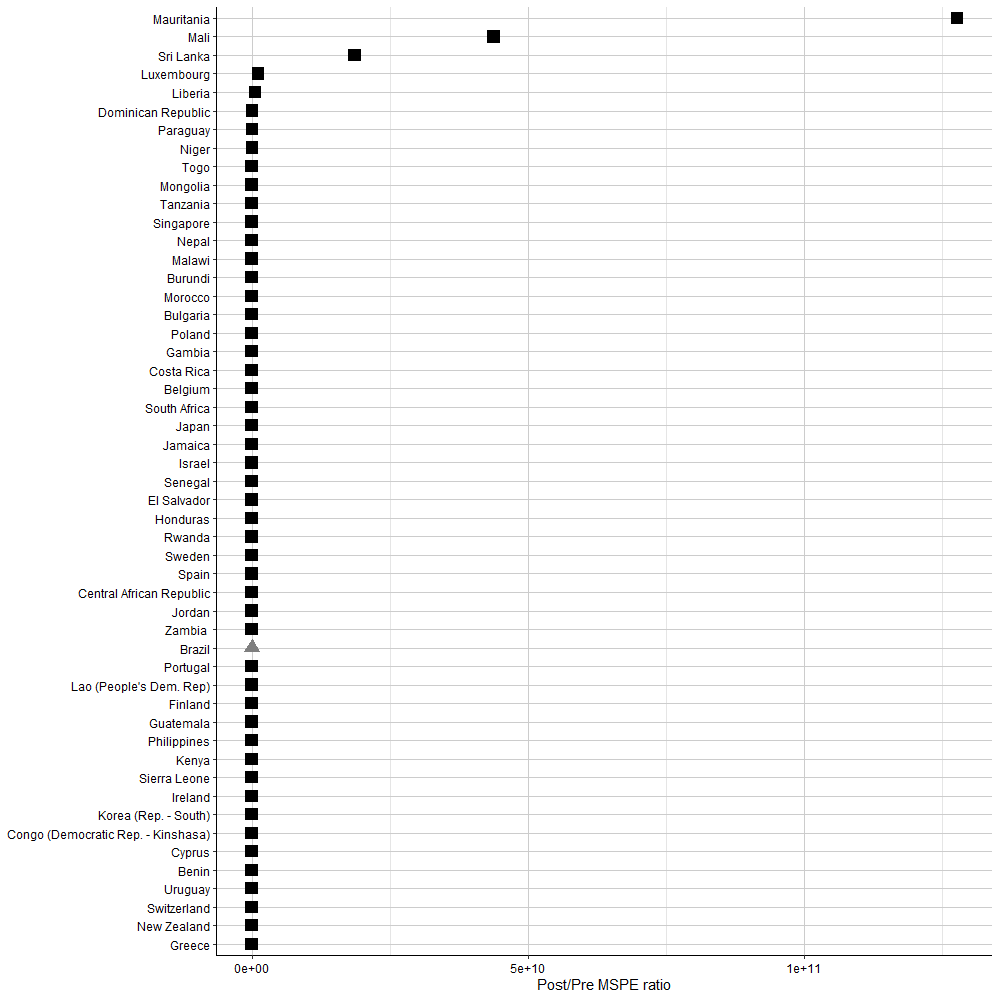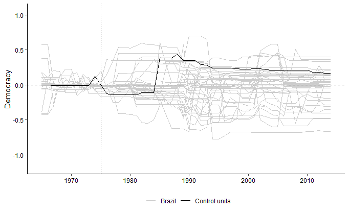 Masi and Ricciuti (2019), for example, re-estimated Brazil synthetic control with this leave-one-out procedure. Then, they evaluated to what extent the findings were driven by a certain control country. The negative effect in Brazil is shorter due to the exclusion of the Democratic Republic of Congo, but, by excluding Portugal, a positive effect was observed! Although this procedure is likely to give up fit, it is a good way to minimize the chances that the results we get are caused by a single country in the donor pool that (un)democratized during the period of analysis.
