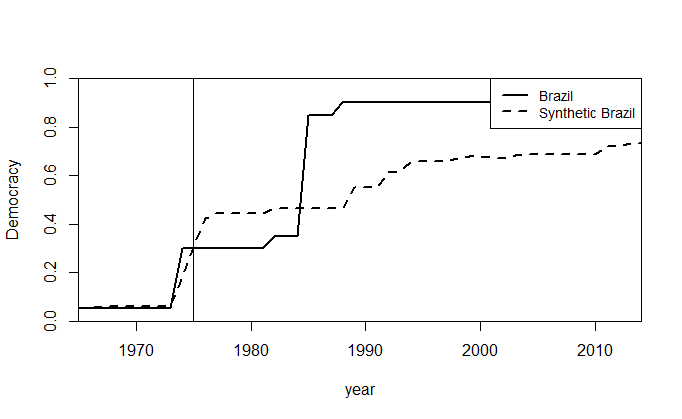 The figure above compares the evolution of democracy level between Brazil and the resulting synthetic control group. Substantively, this means that there was only a short-term effect of oil discovery on the level of democracy in Brazil. In addition to that, the path plot shows that despite a fall in the democracy level in relation to the synthetic control, Brazil overtook its counterpart.